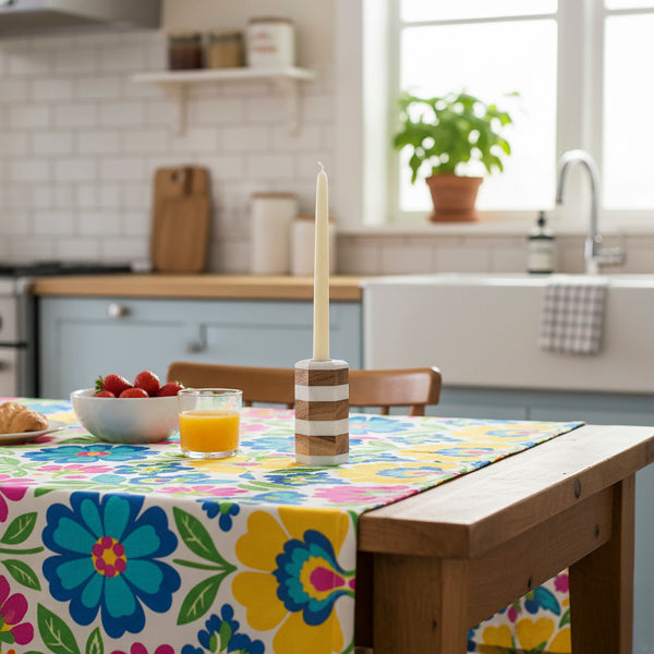 Bring an artful touch to your home with this beautifully crafted candleholder, where polished marble meets the warm, organic grain of acacia wood.